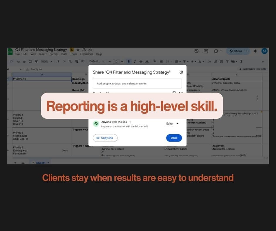 Hi Reader, Reporting pa lang, extend agad ang contract. With just a simple Google Sheet and a quick explanation ng triggers and offers, sobrang engaged na agad ng clients magbigay ng inputs. Kapag marami kang na-record, mas juicy tingnan. I summarized 9 months’ report sa isang table, nakaka-drain yung numbers, pero sulit kasi ang priceless ng insights. Turns out, kahit brands like Coke, Unilever, and beer companies… they also struggling pano interpret ng data. Pag maglaunch ng bagong flavor, tanong nila: sino madalas bibili, Gen Z or Millennial? O pag outreach ka, sino madalas sumagot ? CEO ba o HR? Yung ganyan skills, napakahighlevel nya tlaga. ____Question: Kayo, anong pinaka-challenging part ng reporting sa inyo? Kung pano sya ipresent or ano ilalagay sa report? LMK, if may gusto pa kayo malaman about LinkedIn chats. — Mary, your leadgen bestie |